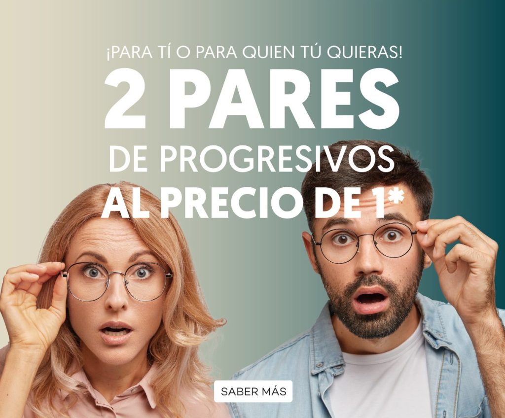 Llévate dos gafas progresivas de última generación al precio de una. Disfruta de una visión nítida y cómoda en todas las distancias y decide cómo aprovechar esta oferta: puedes quedarte con ambas para tener un par extra o compartir con alguien especial.